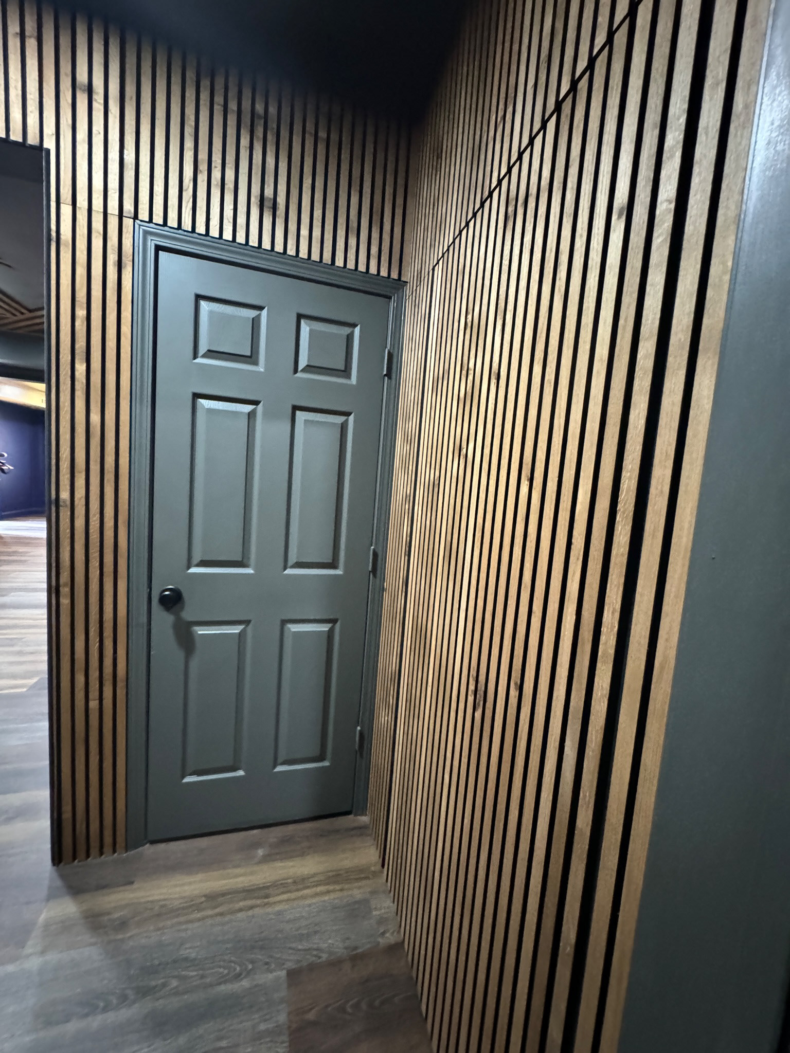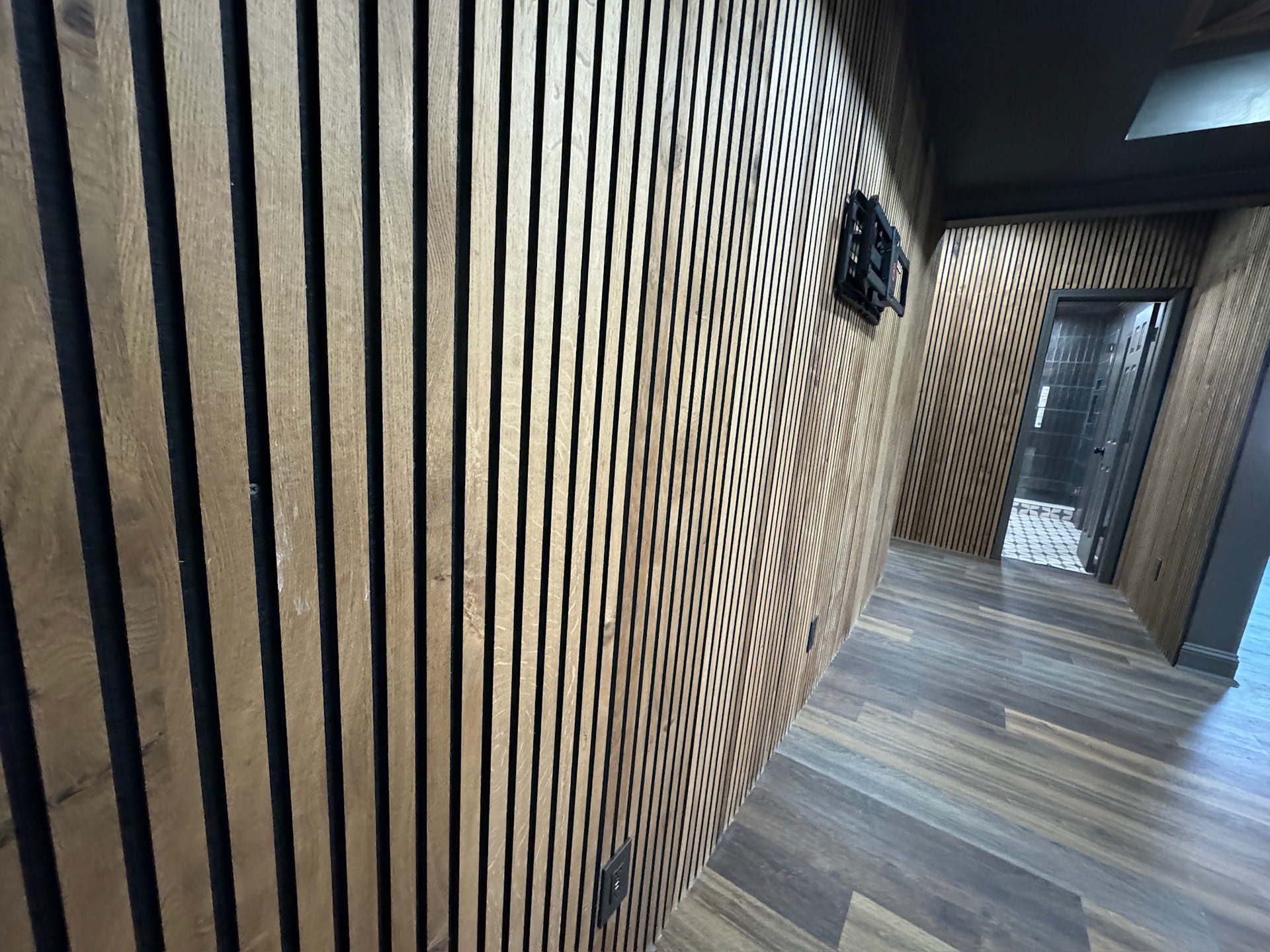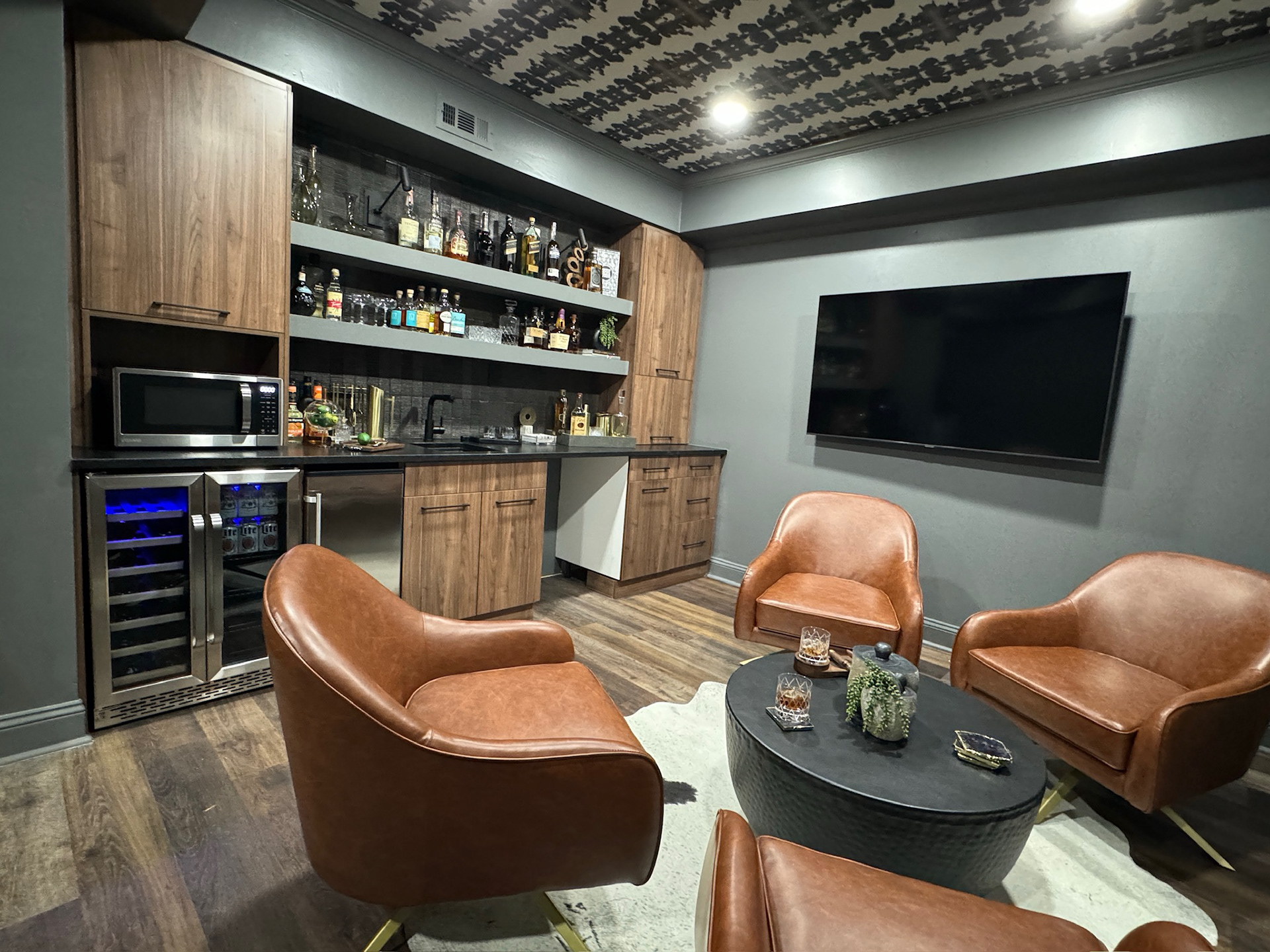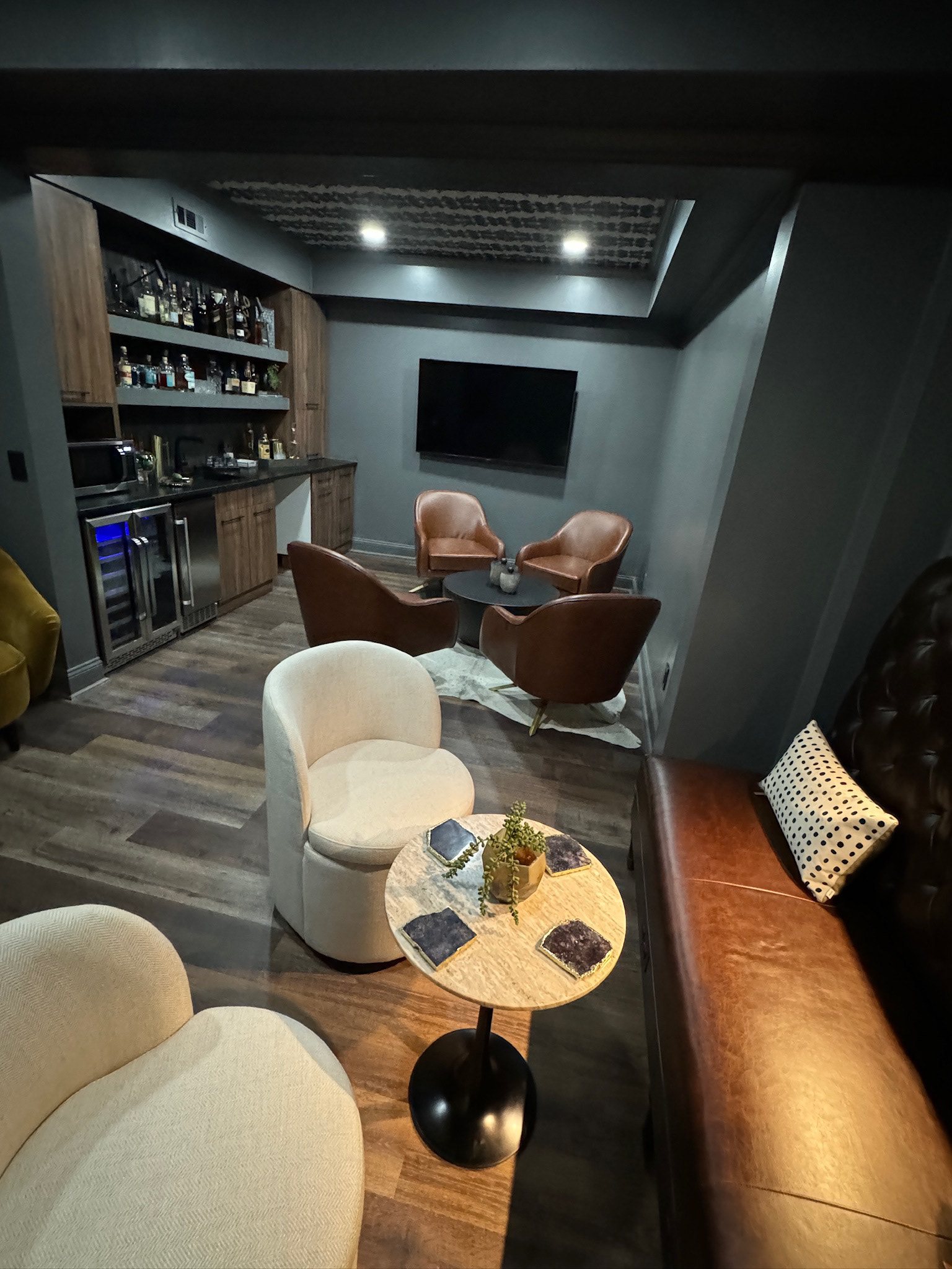 The basement was transformed into an entertainer’s dream with the addition of a hidden speakeasy, tucked discreetly behind slatted wood walls. The space maintains a sophisticated ambiance while offering a unique feature that blends seamlessly into the overall design aesthetic.