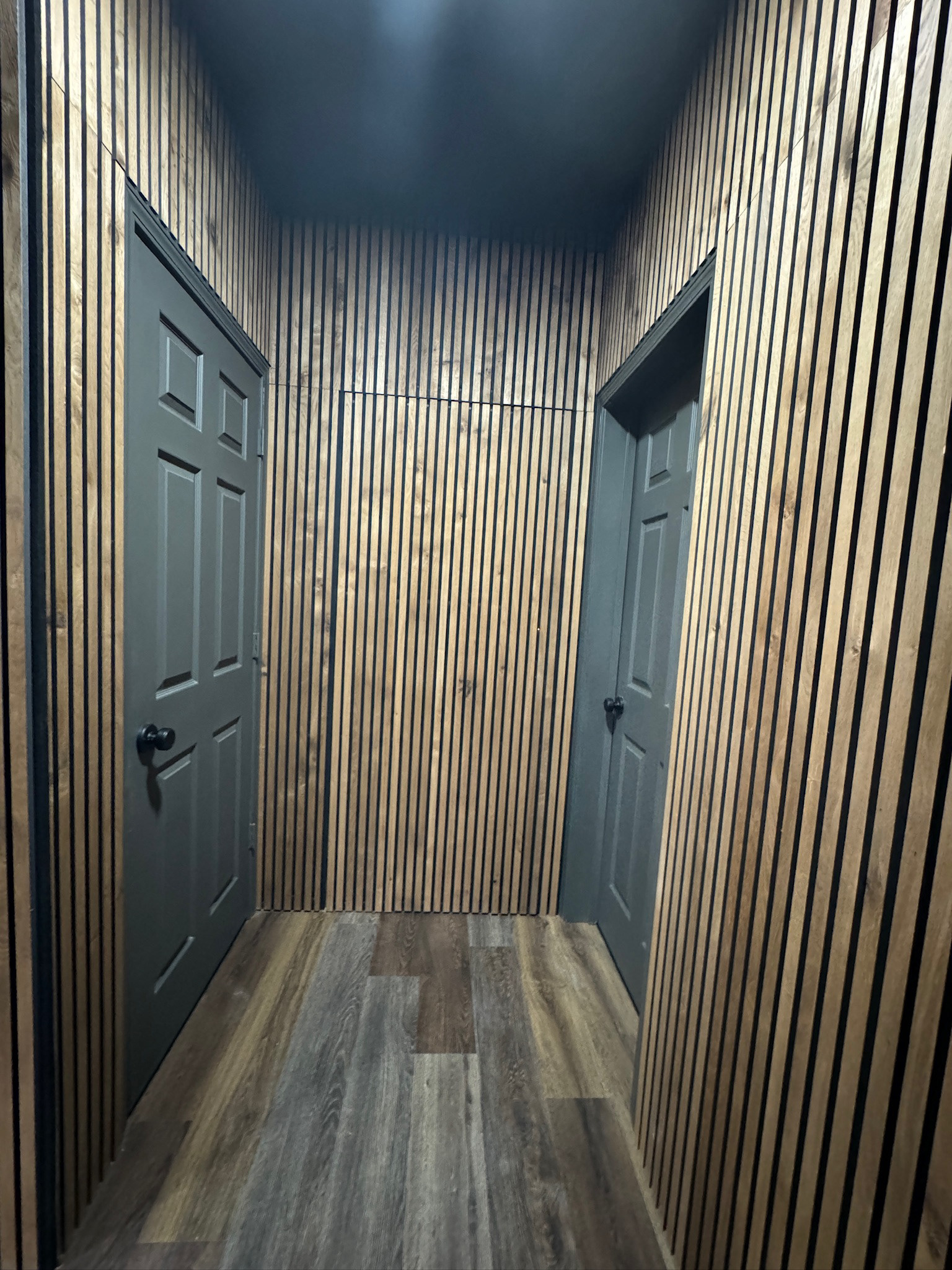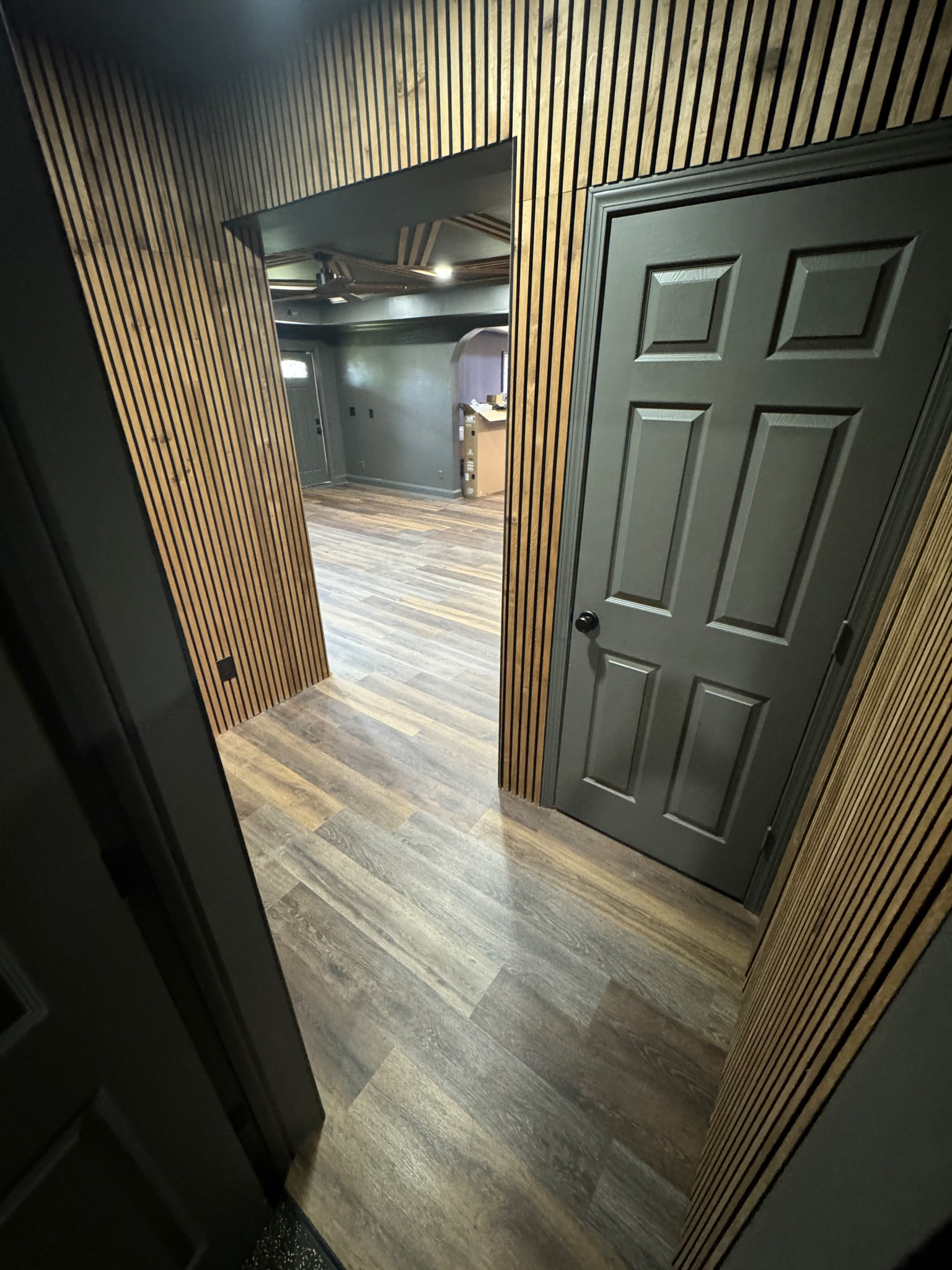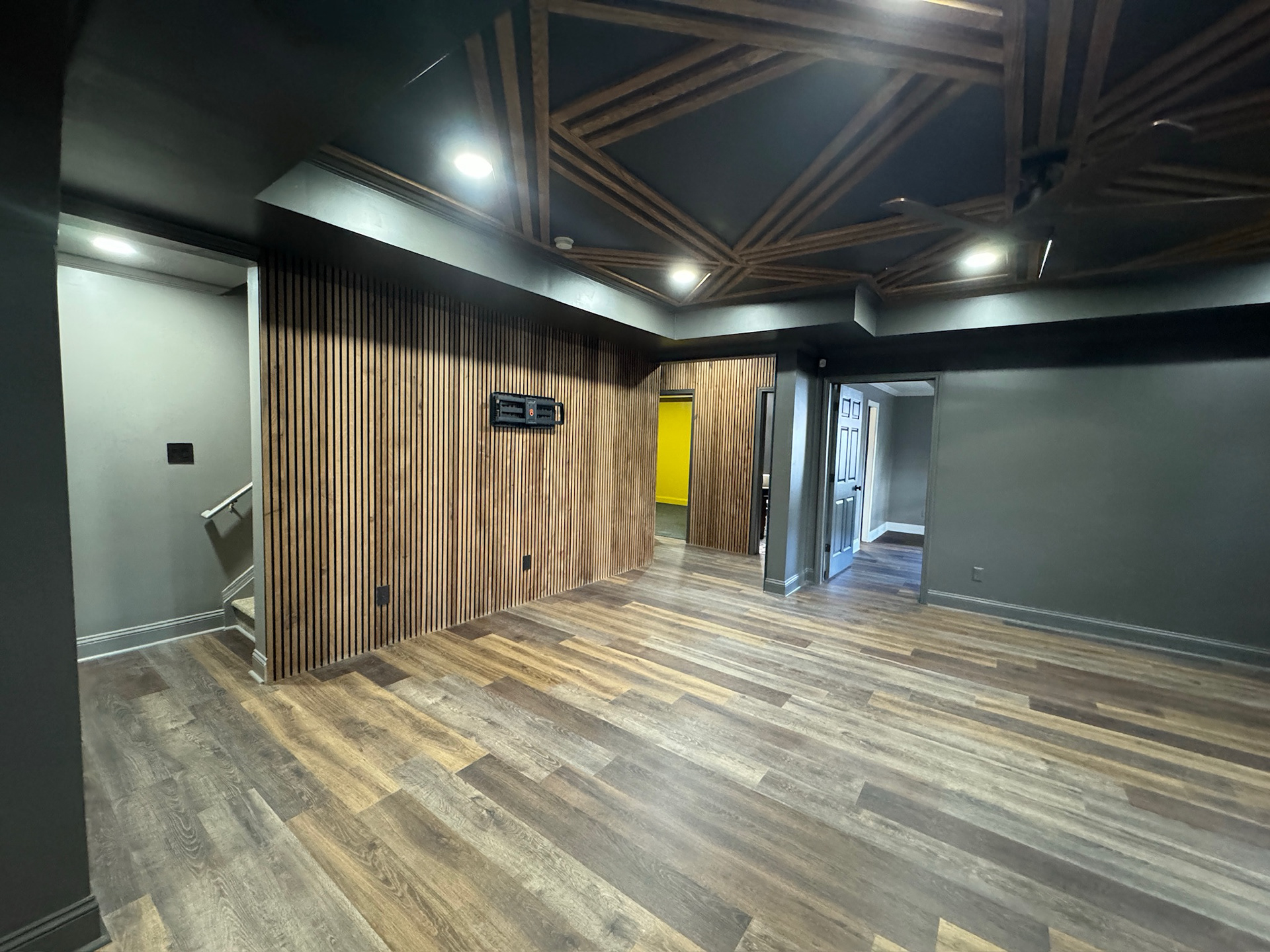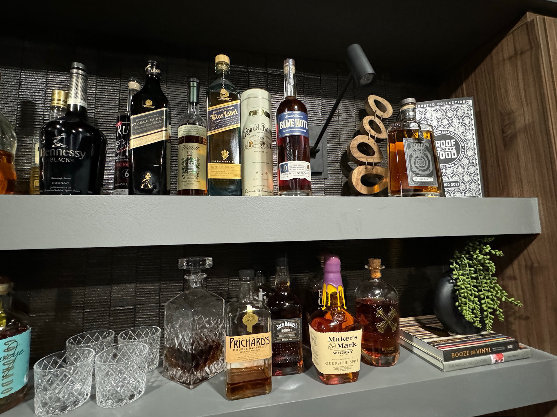 The basement was transformed into an entertainer’s dream with the addition of a hidden speakeasy, tucked discreetly behind slatted wood walls. The space maintains a sophisticated ambiance while offering a unique feature that blends seamlessly into the overall design aesthetic.
