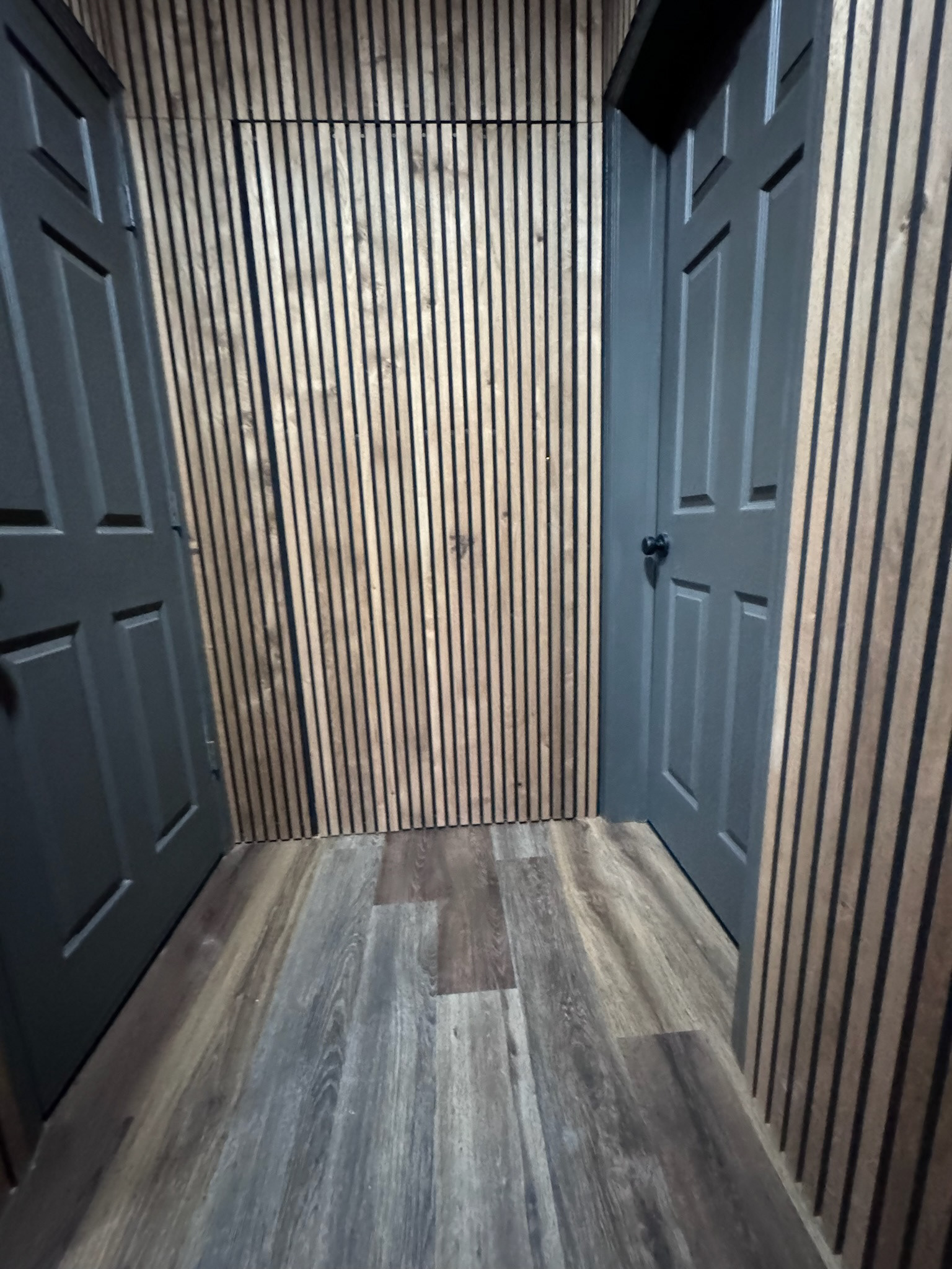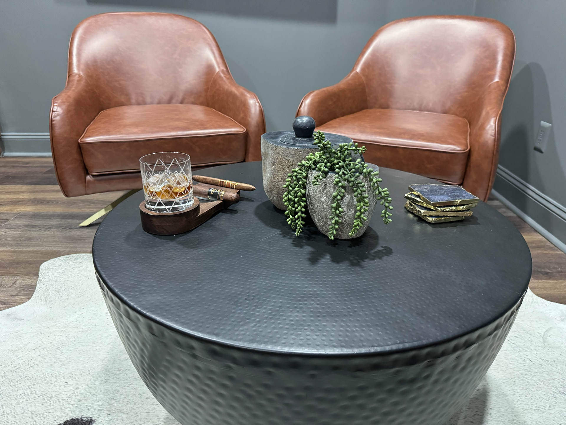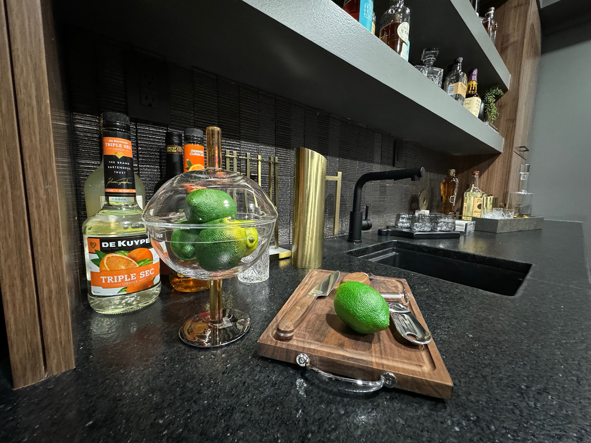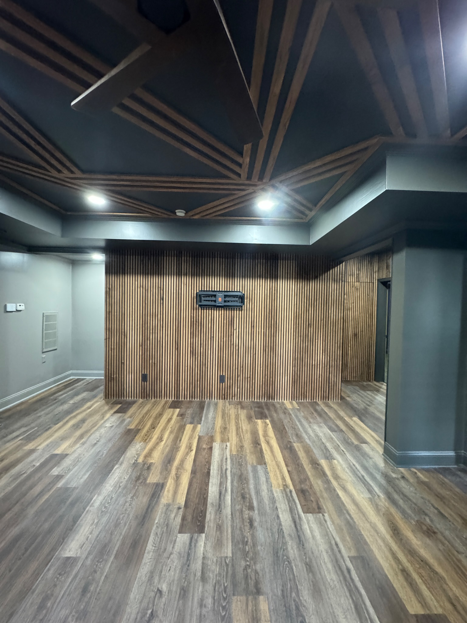 The basement was transformed into an entertainer’s dream with the addition of a hidden speakeasy, tucked discreetly behind slatted wood walls. The space maintains a sophisticated ambiance while offering a unique feature that blends seamlessly into the overall design aesthetic.