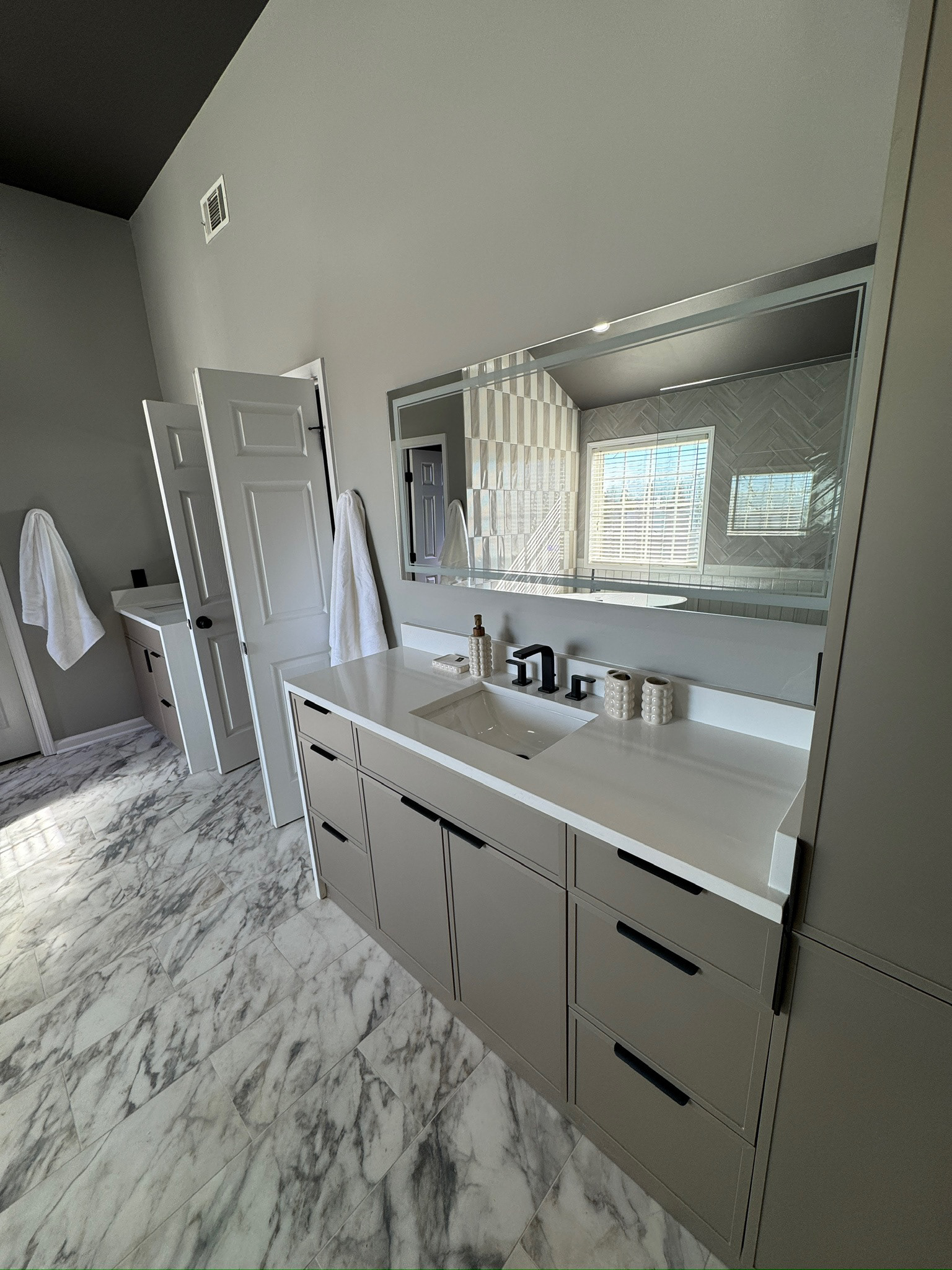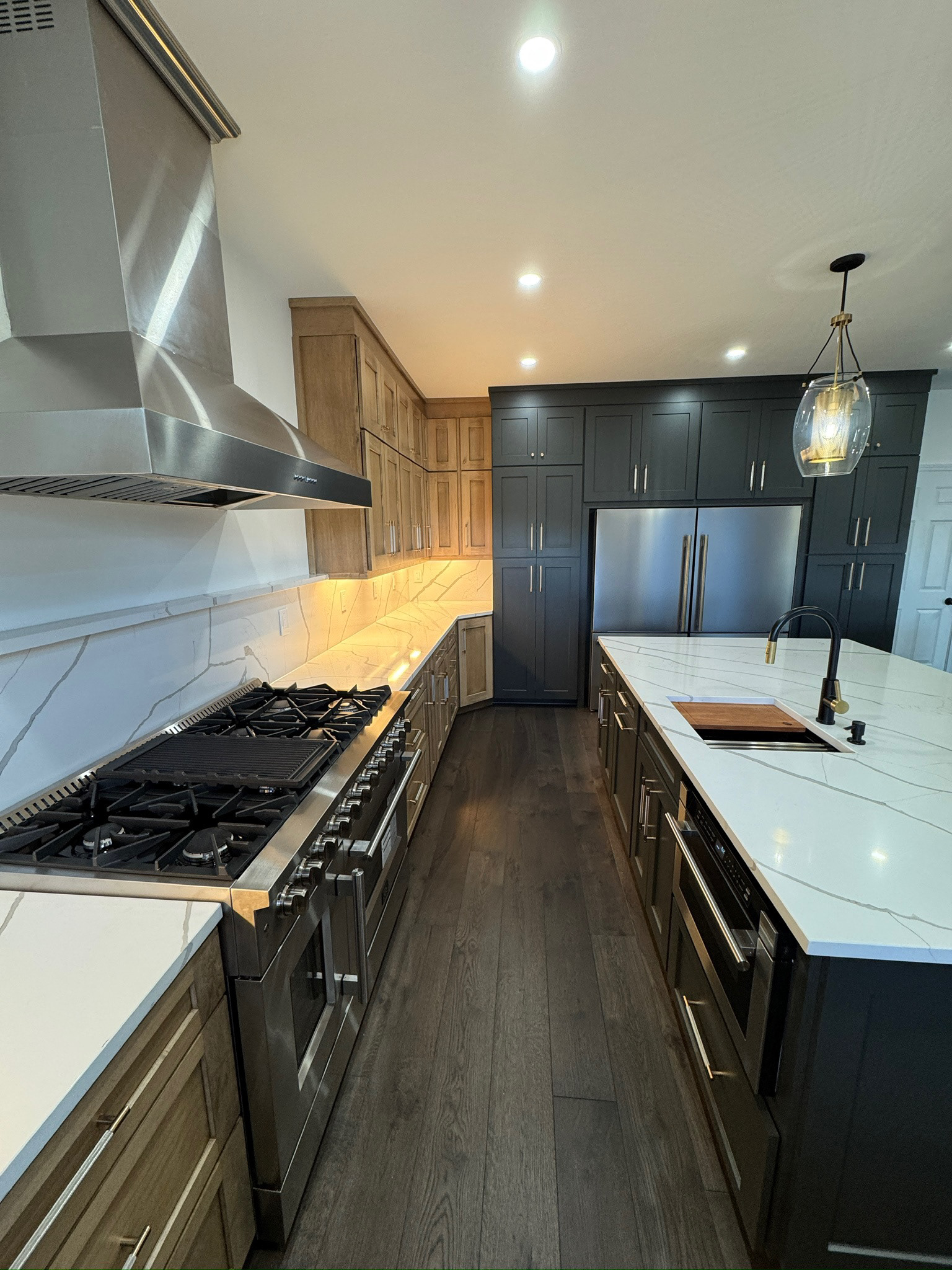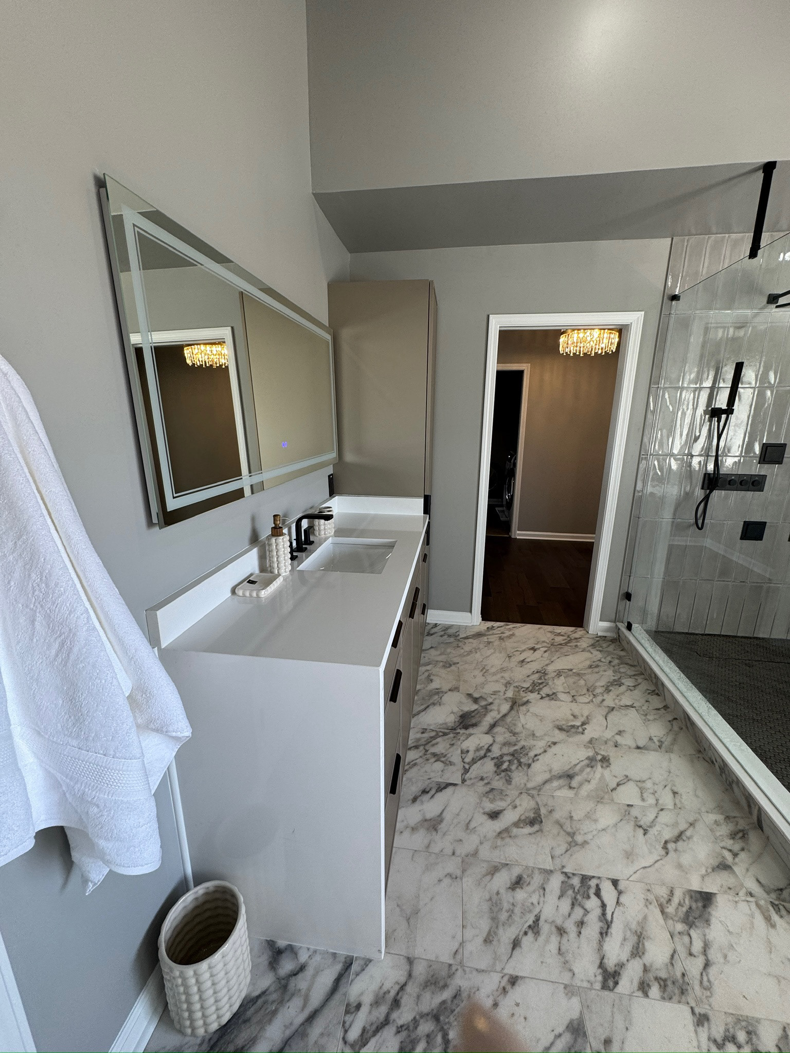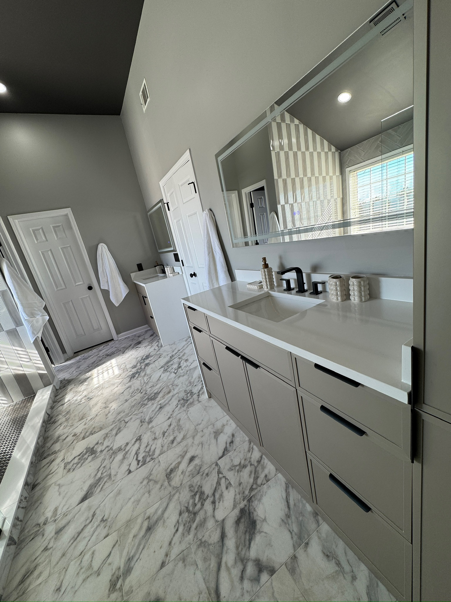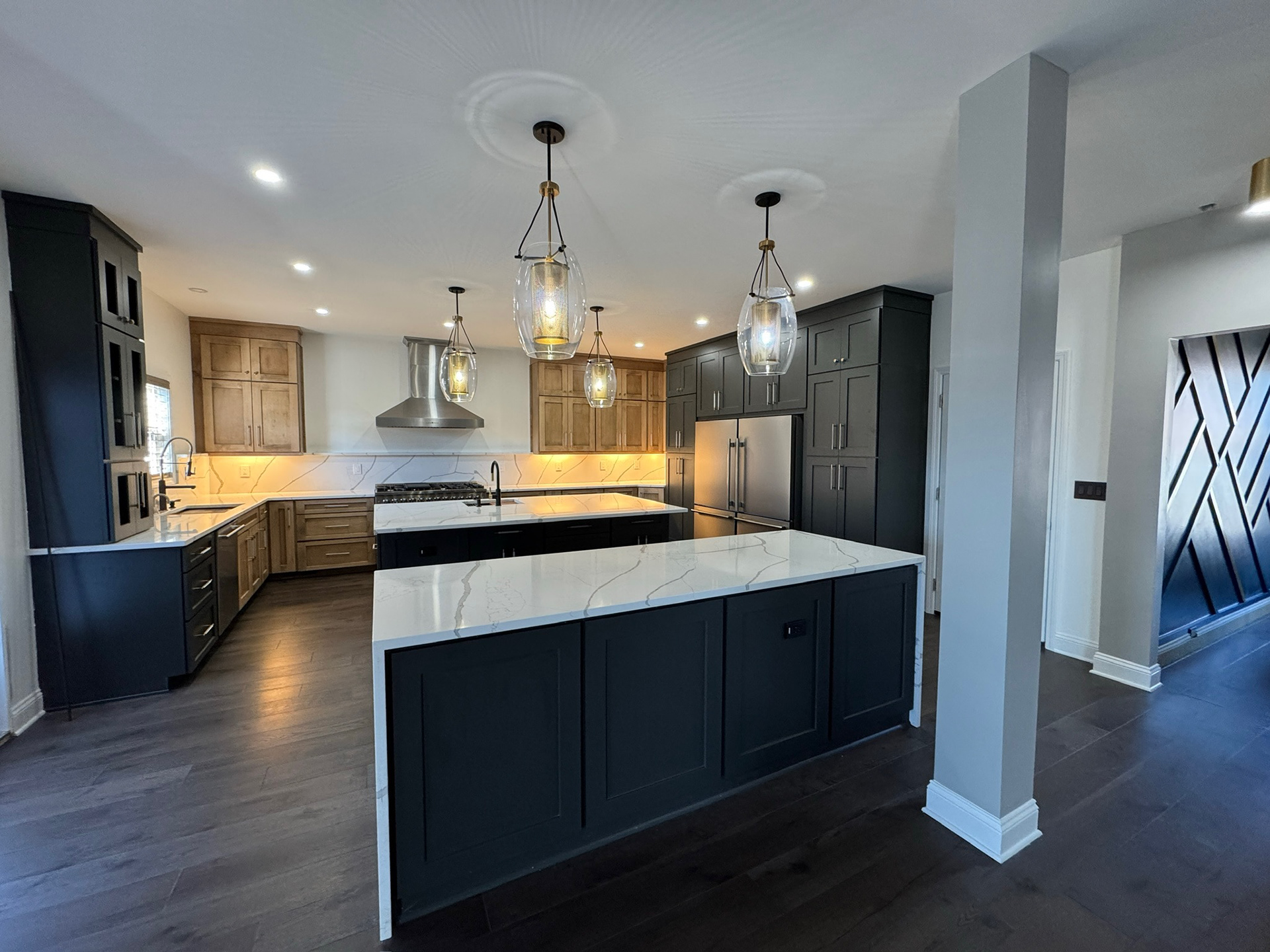 The main floor was completely reimagined to enhance functionality and flow. The formerly two-story family room was enclosed to create a new upper level, while the living areas received all-new flooring, upgraded lighting, and fresh paint throughout. The kitchen footprint was expanded to feature double islands, dual refrigerators, and a 45-inch professional stove, making it the ultimate entertainer’s kitchen. Every bathroom on this level was refreshed with new vanities, fixtures, and lighting, giving the entire space a cohesive modern feel.