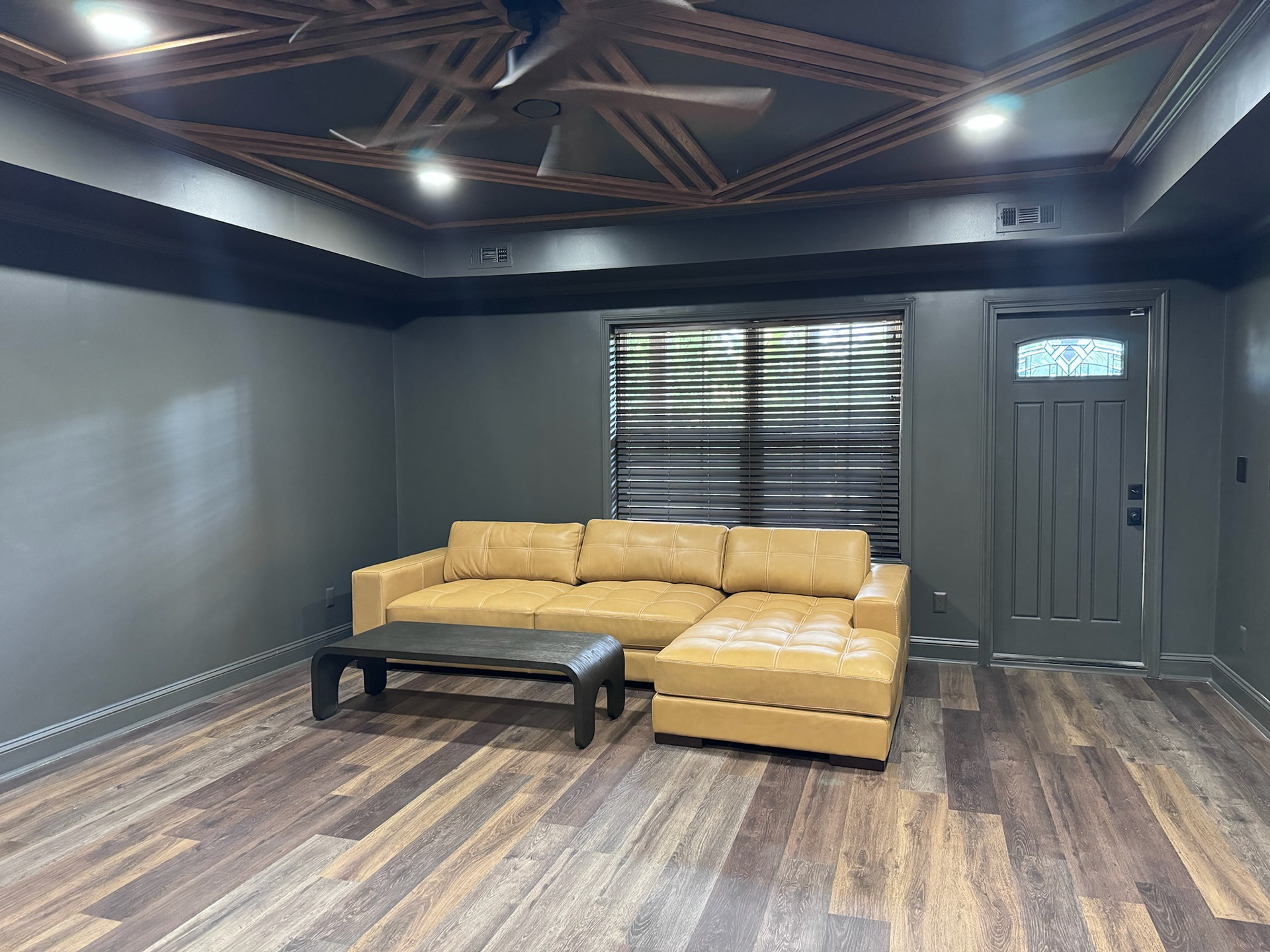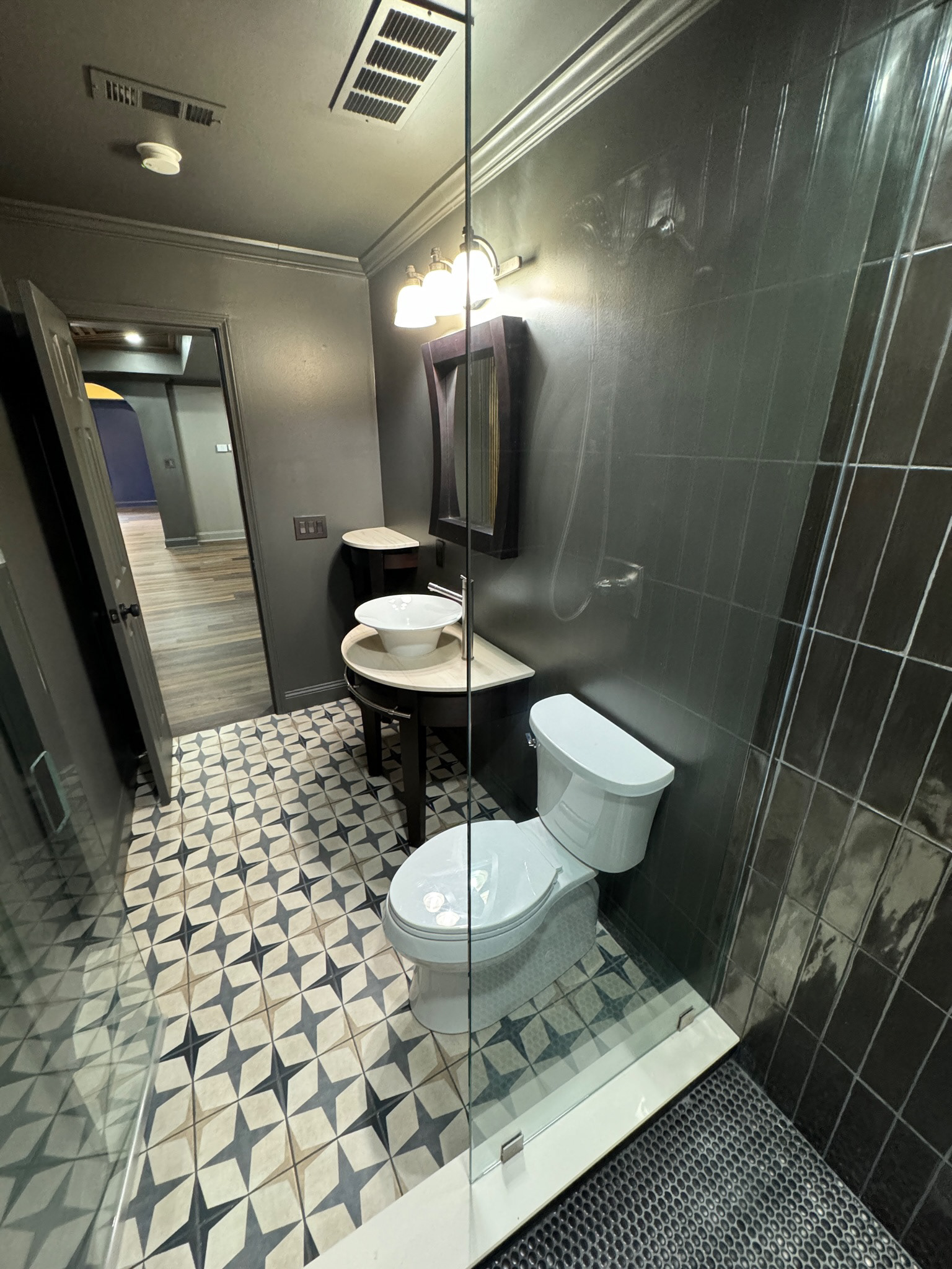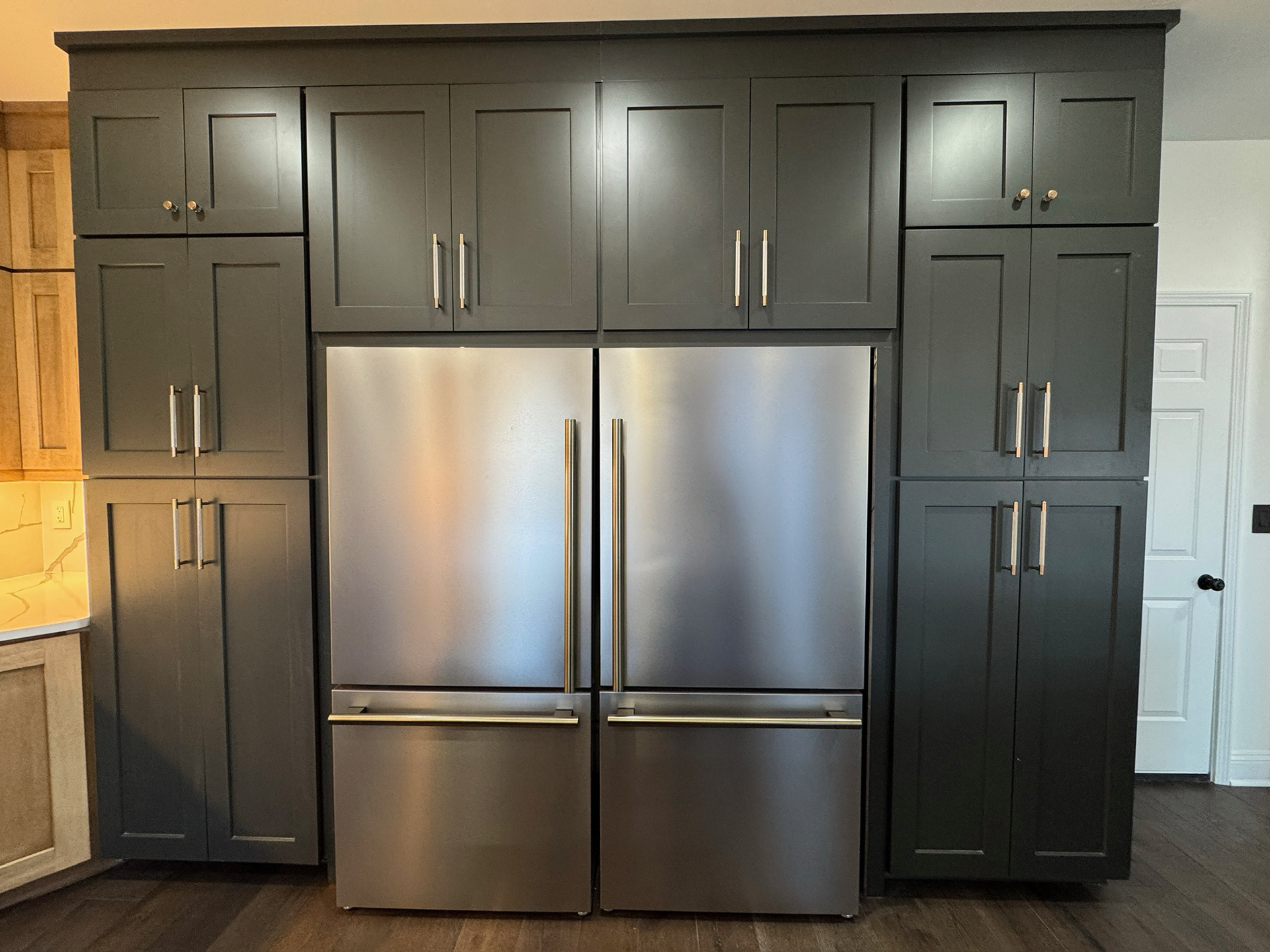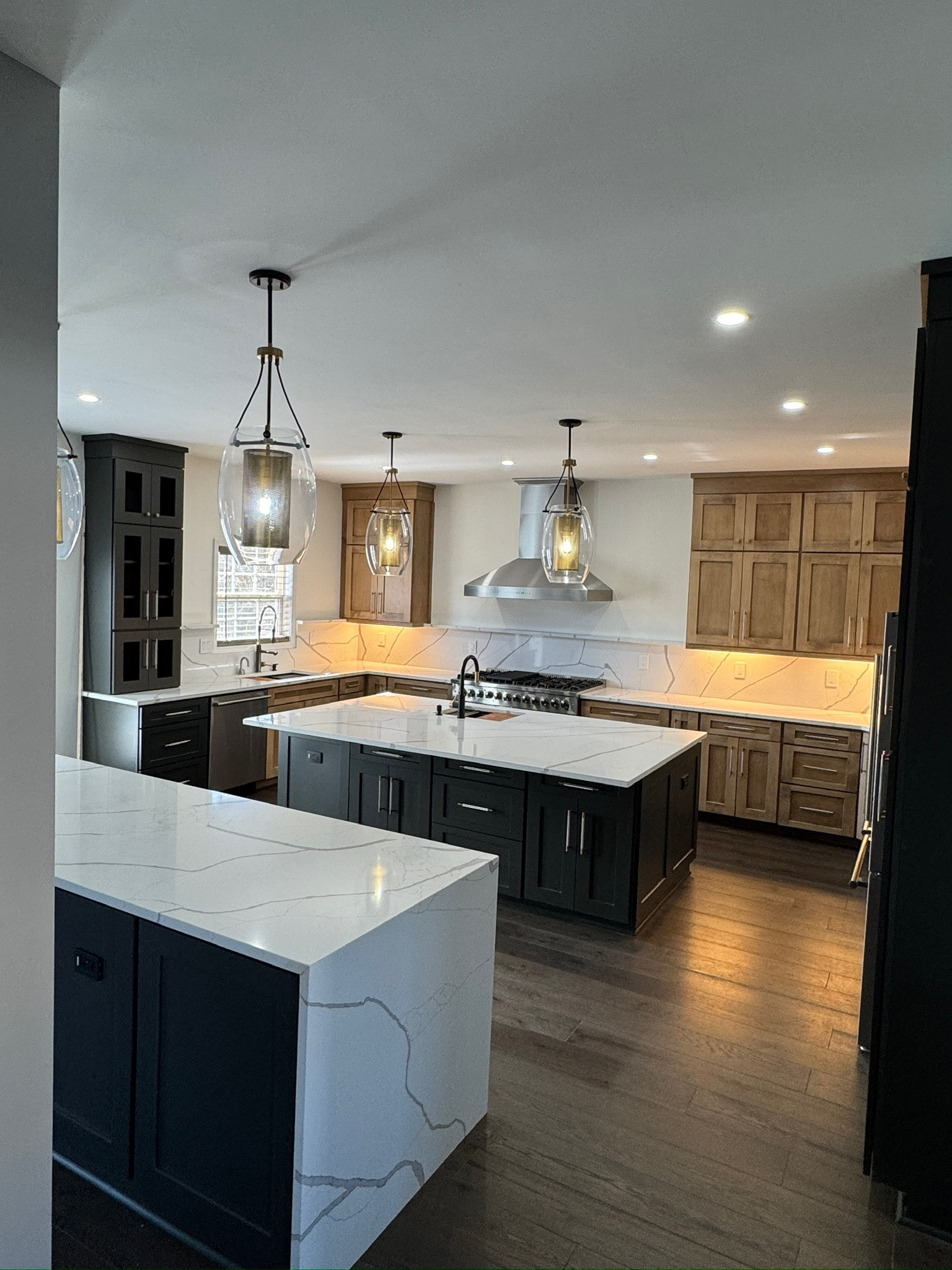 The main floor was completely reimagined to enhance functionality and flow. The formerly two-story family room was enclosed to create a new upper level, while the living areas received all-new flooring, upgraded lighting, and fresh paint throughout. The kitchen footprint was expanded to feature double islands, dual refrigerators, and a 45-inch professional stove, making it the ultimate entertainer’s kitchen. Every bathroom on this level was refreshed with new vanities, fixtures, and lighting, giving the entire space a cohesive modern feel.