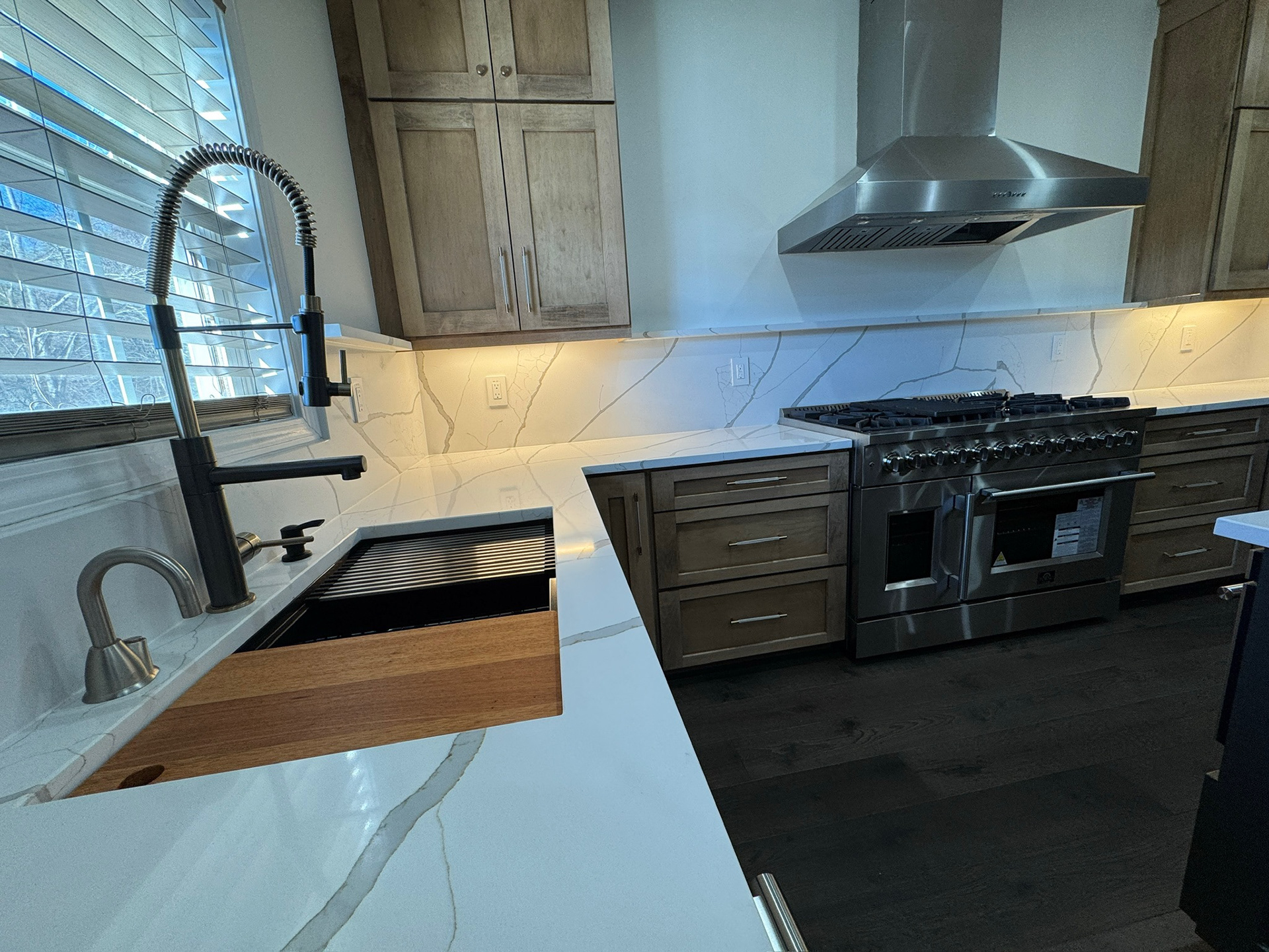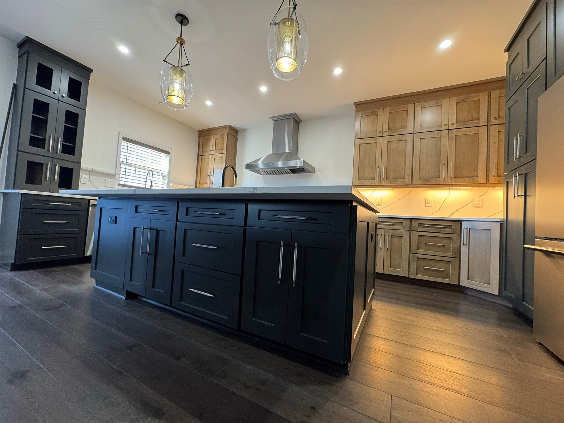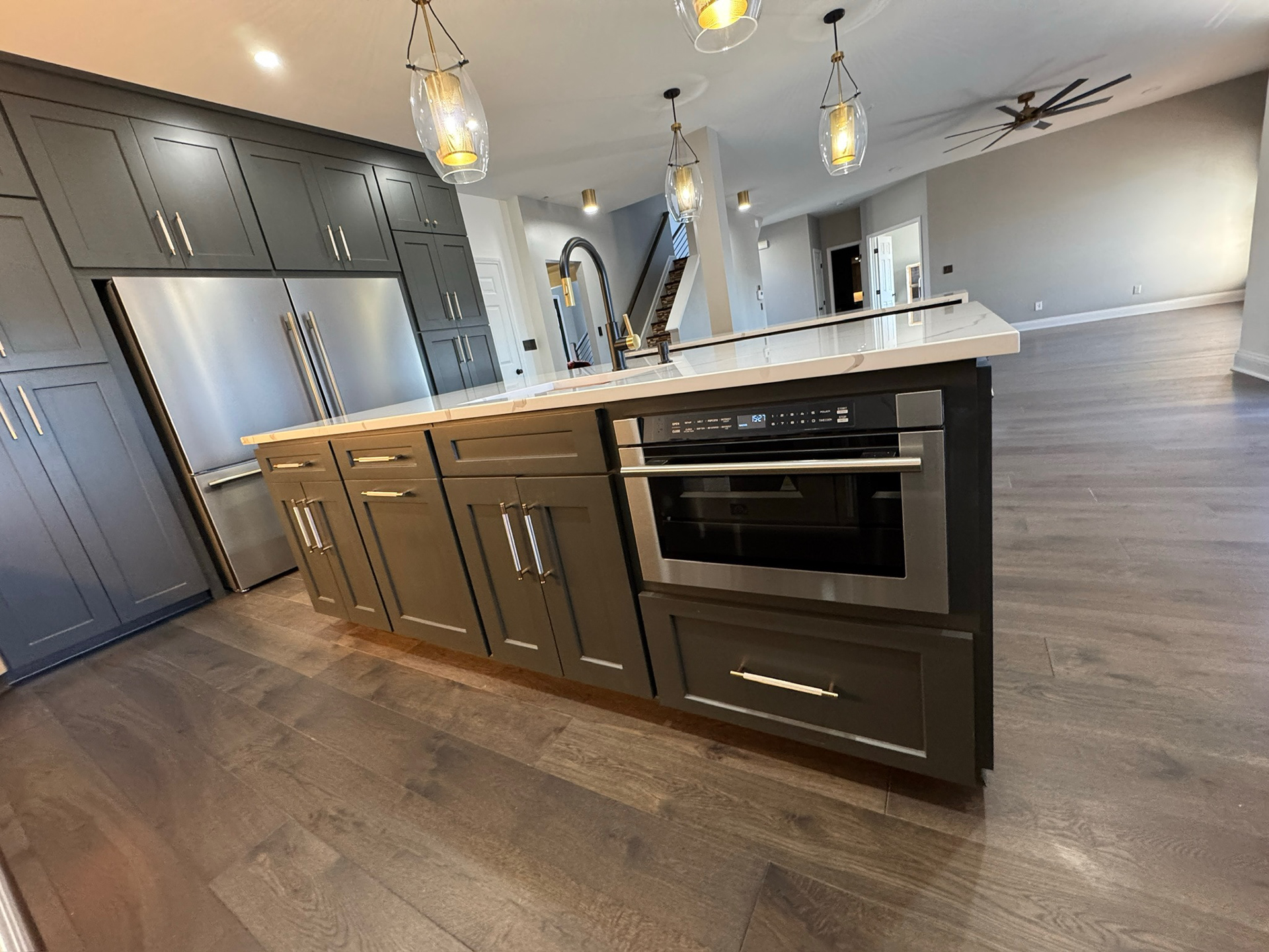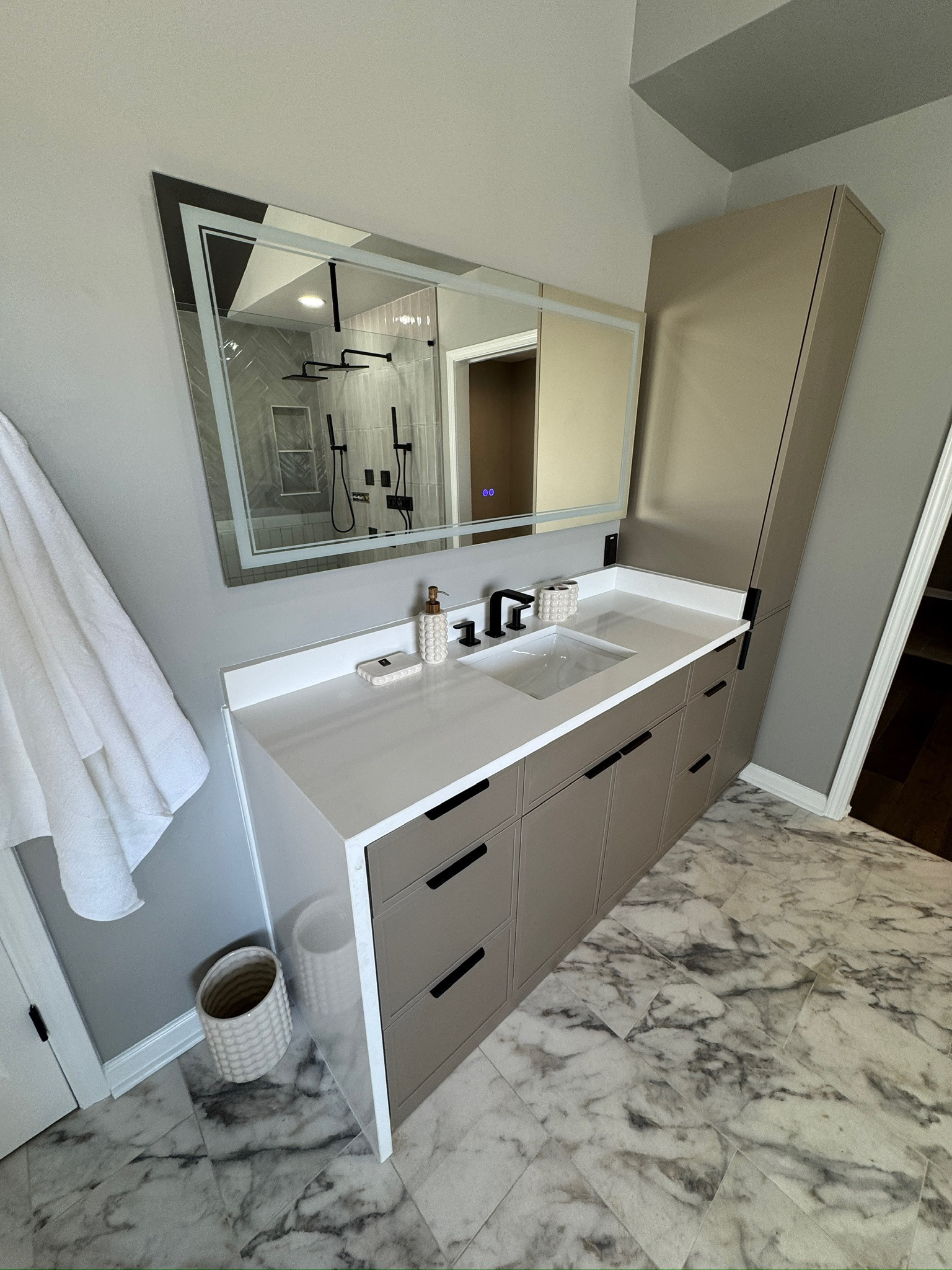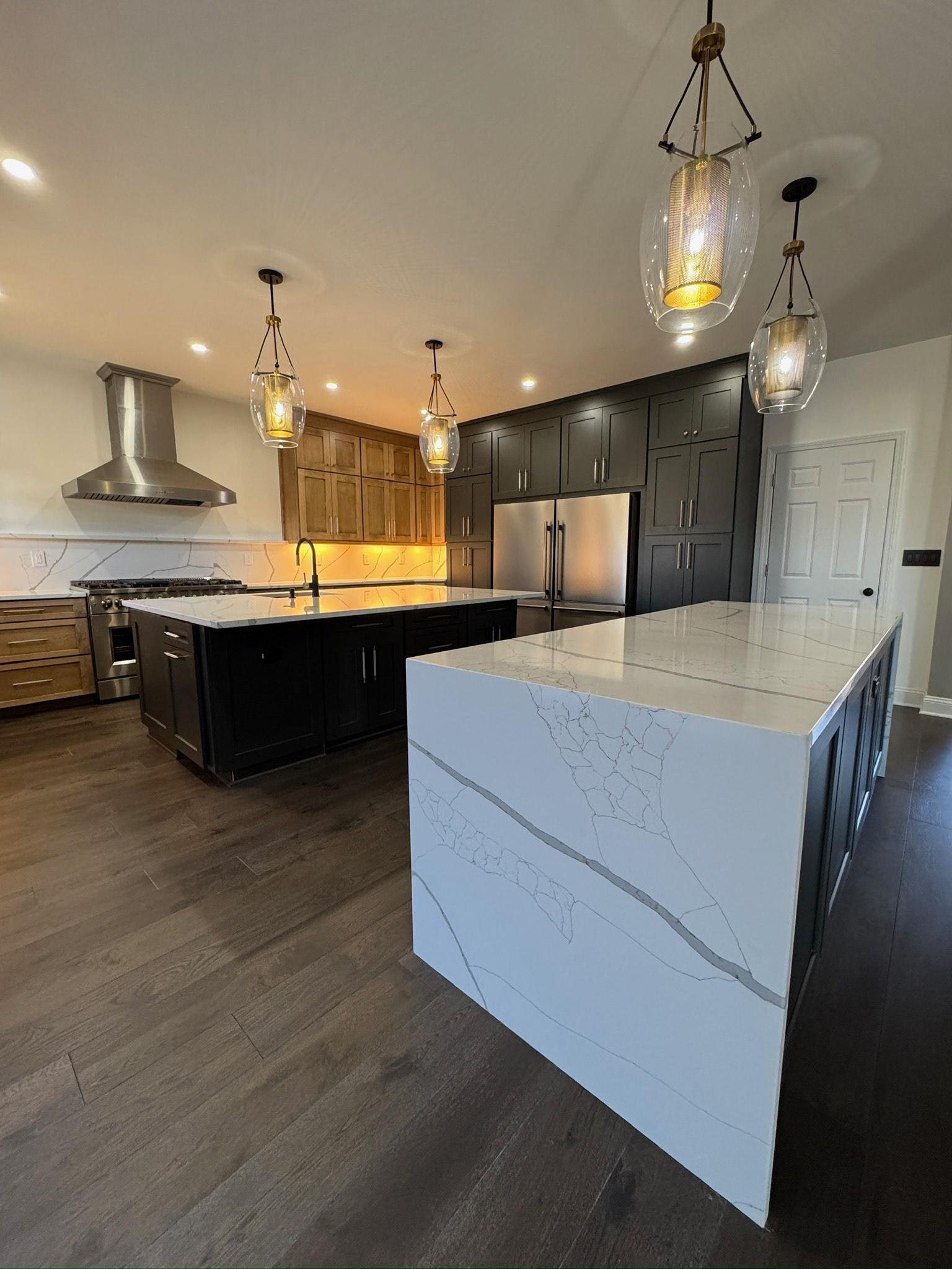 The main floor was completely reimagined to enhance functionality and flow. The formerly two-story family room was enclosed to create a new upper level, while the living areas received all-new flooring, upgraded lighting, and fresh paint throughout. The kitchen footprint was expanded to feature double islands, dual refrigerators, and a 45-inch professional stove, making it the ultimate entertainer’s kitchen. Every bathroom on this level was refreshed with new vanities, fixtures, and lighting, giving the entire space a cohesive modern feel.
