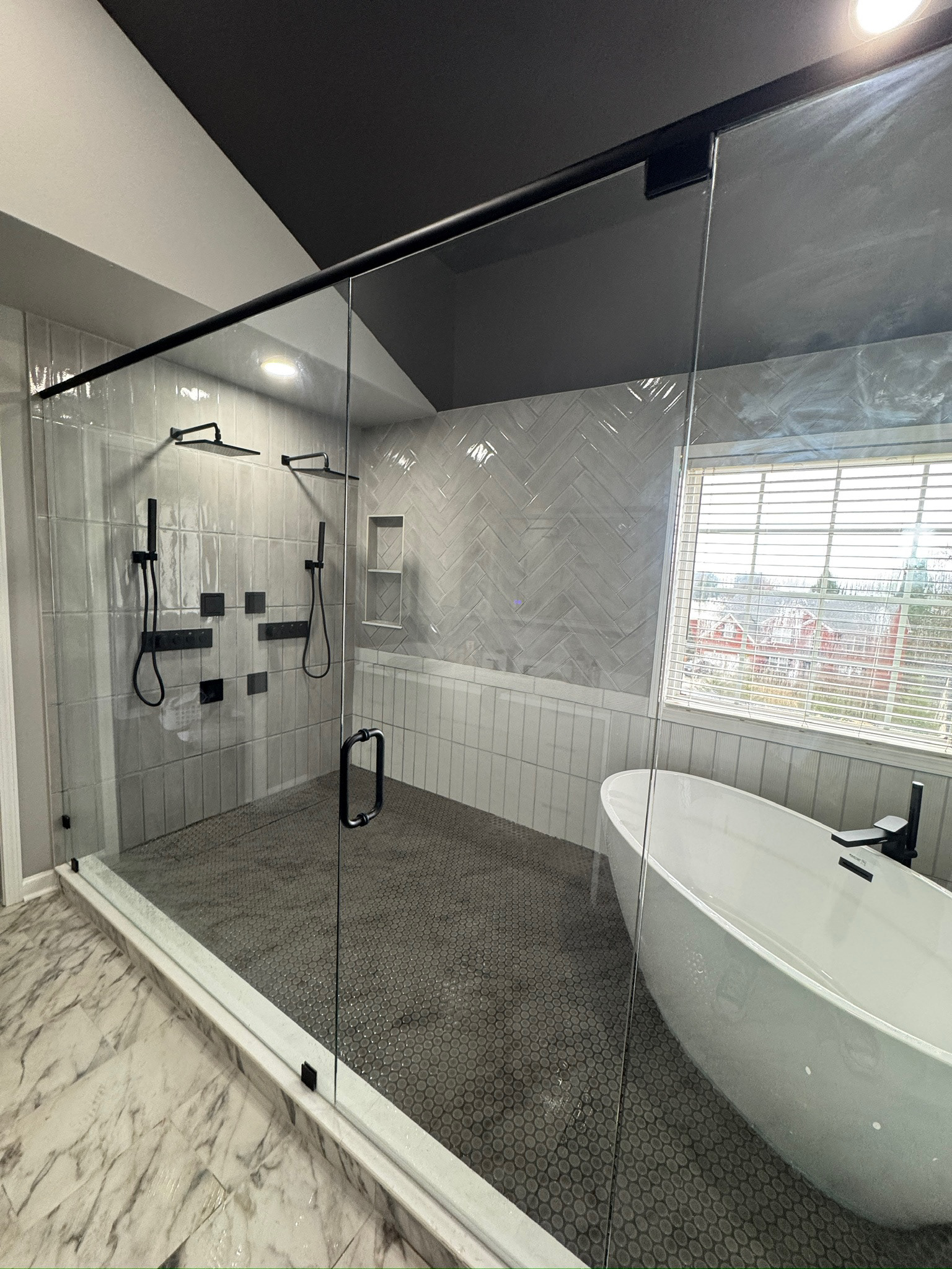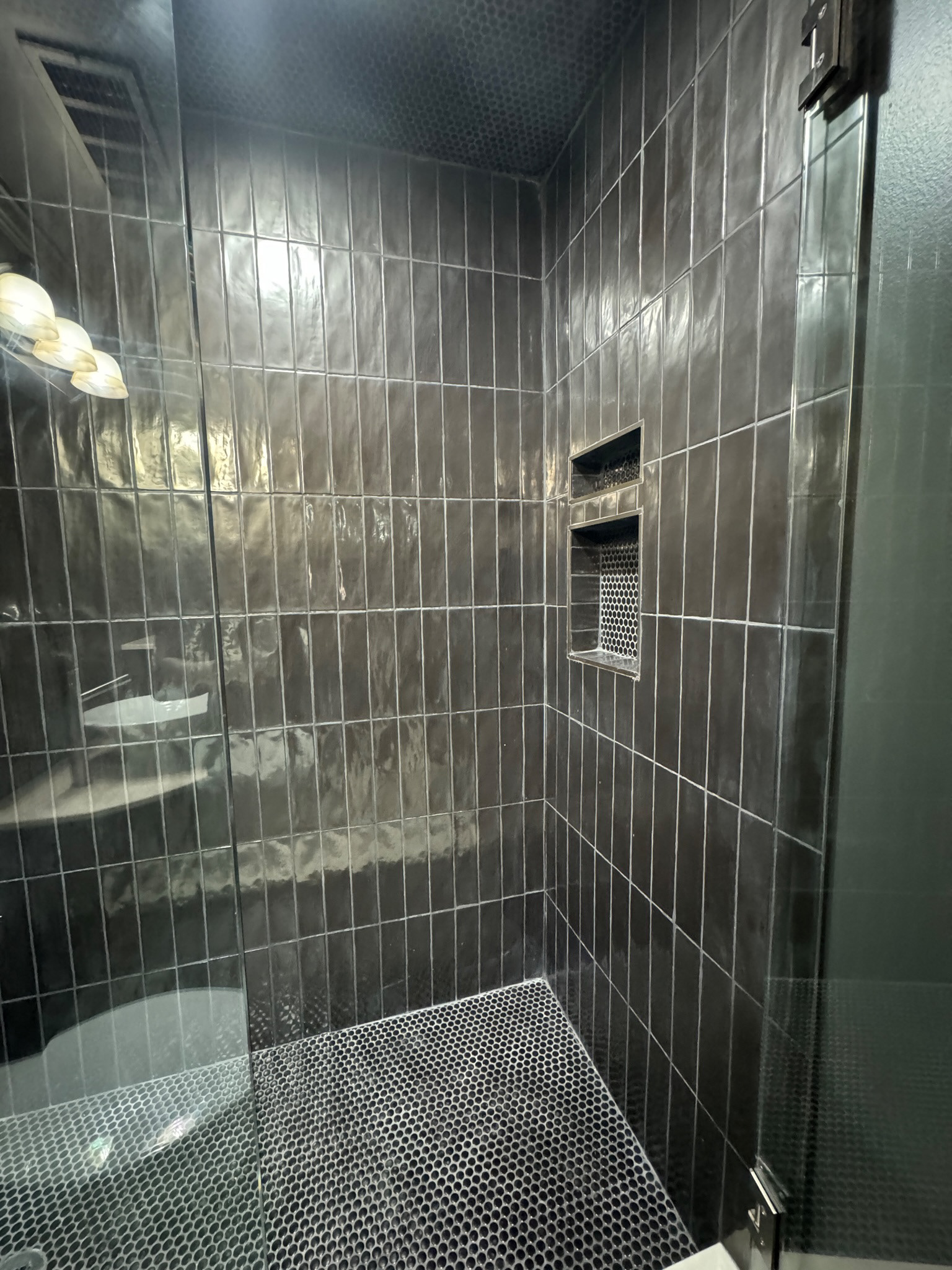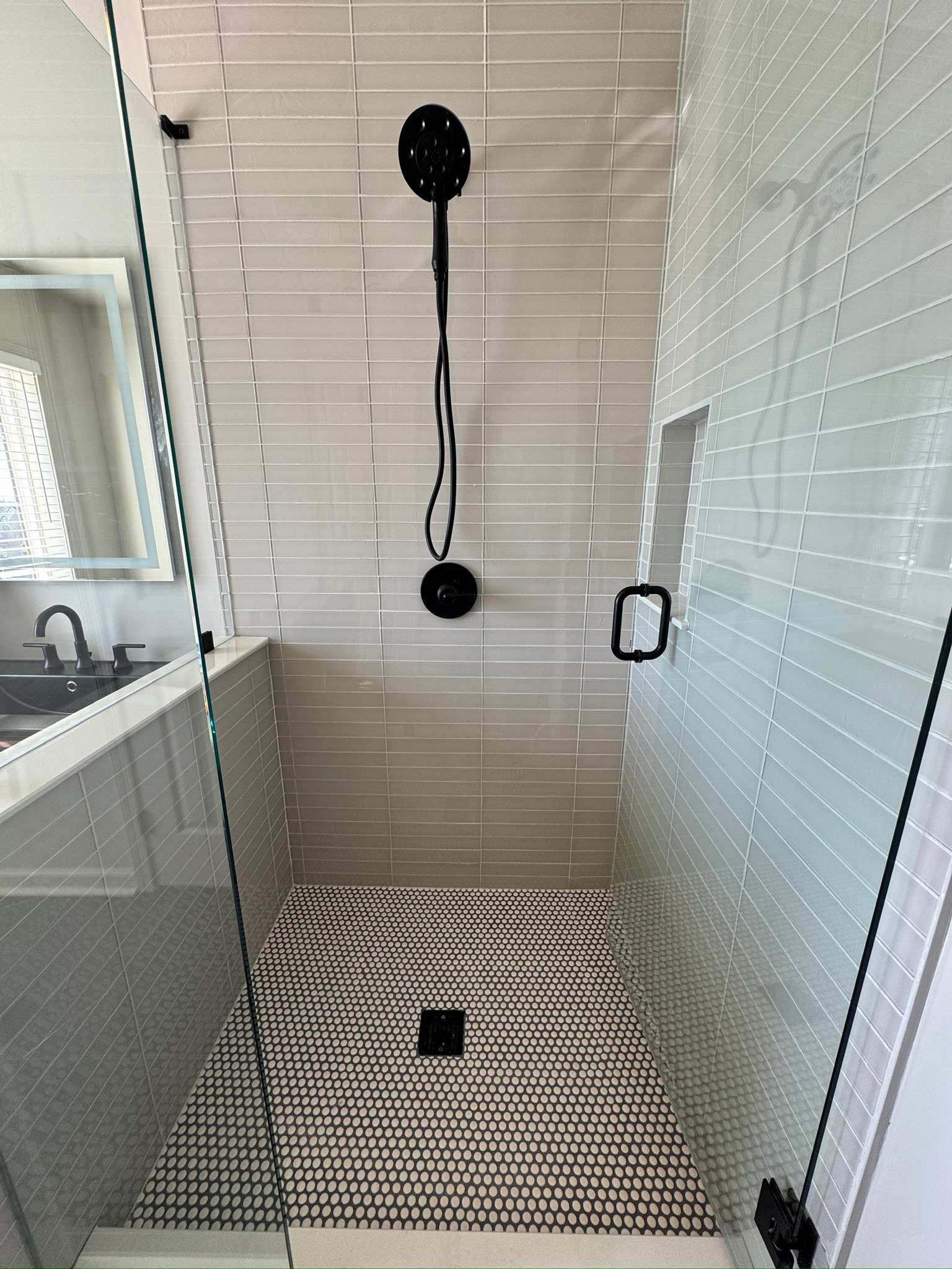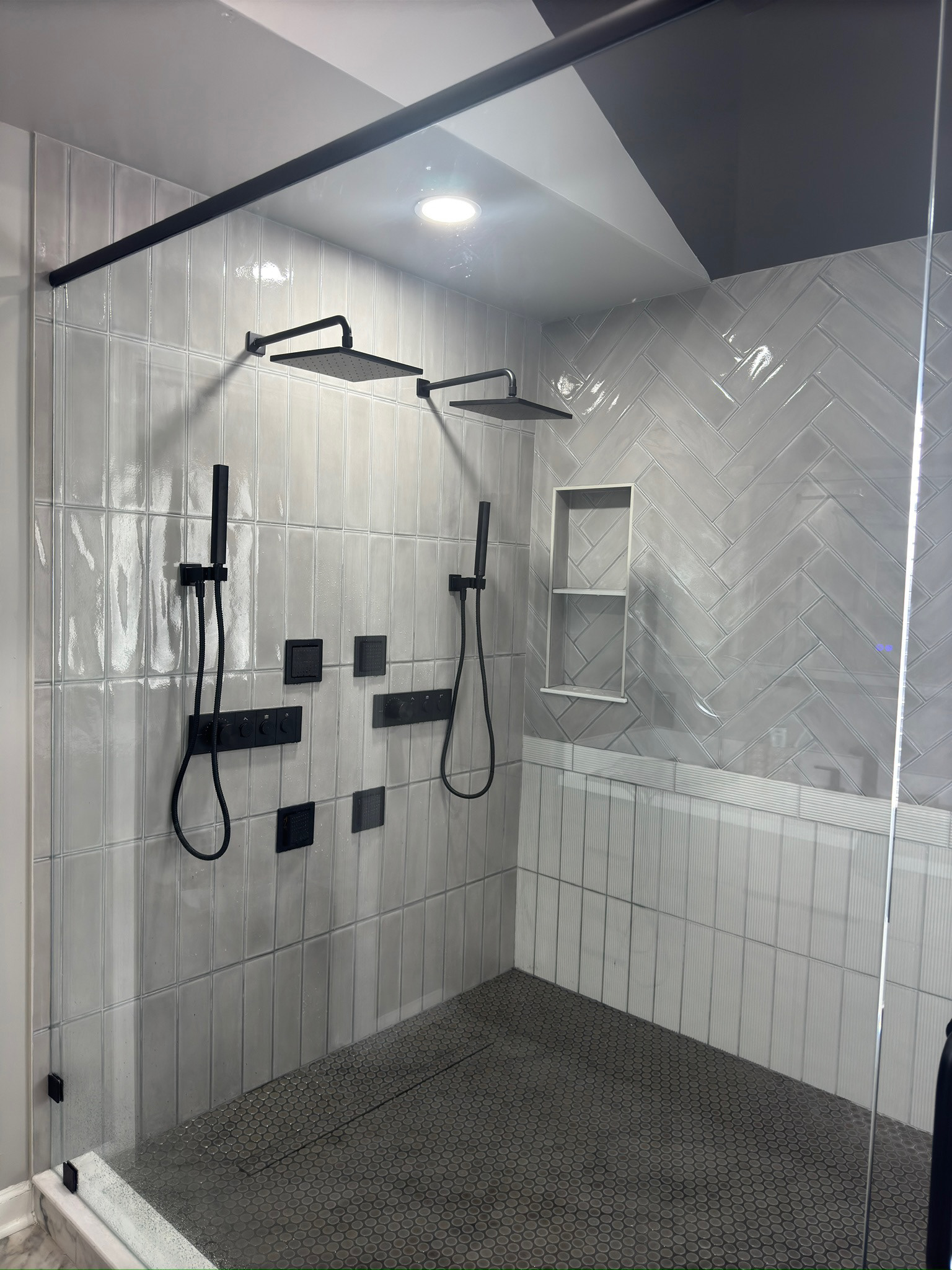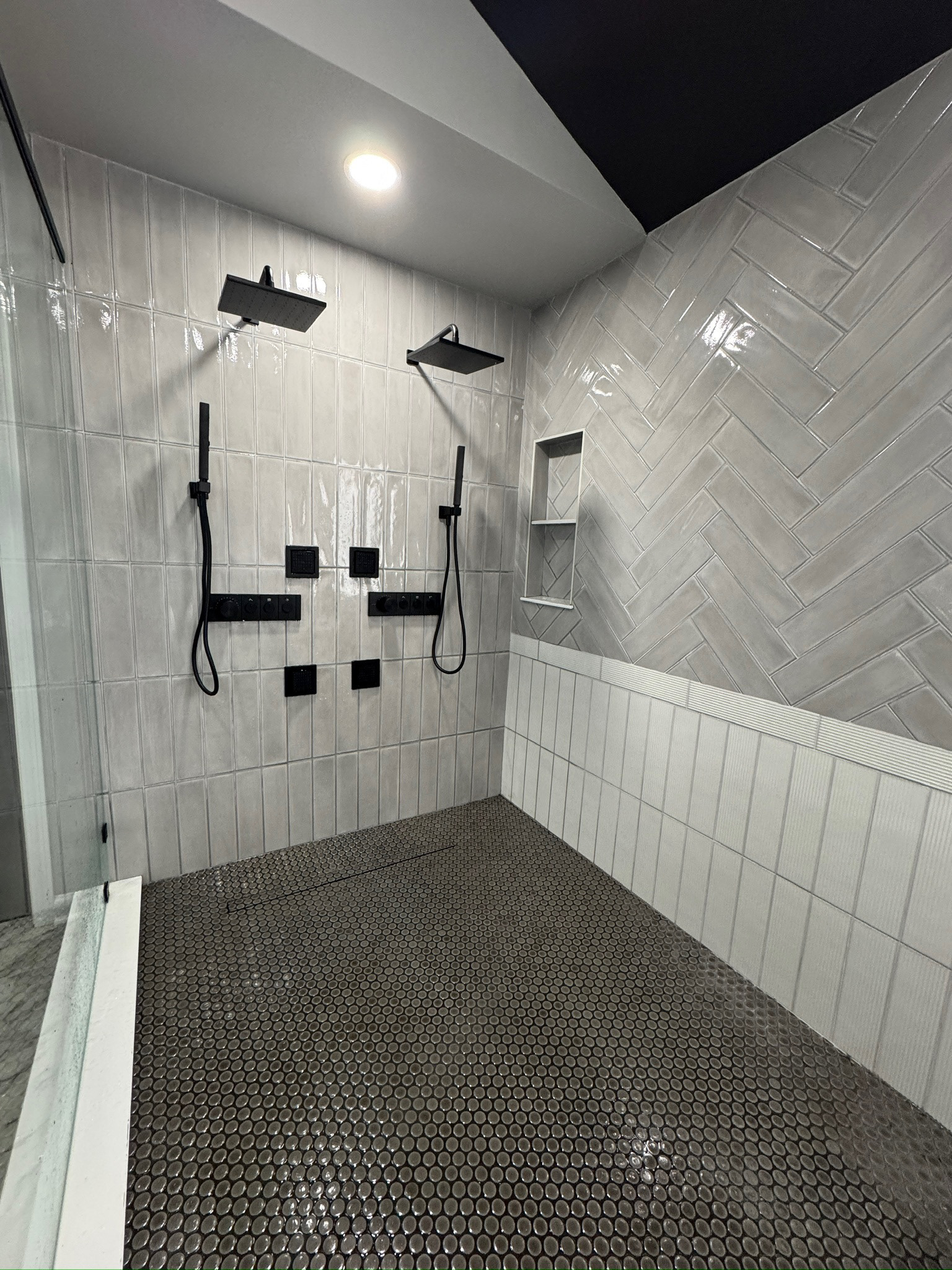 The newly added upper level above the former family room houses a full ensuite bath, a relocated laundry room, and a luxurious women’s closet that conceals a prayer room. The primary suite was also expanded to include a custom wet room with double rain showerheads, body jets, and body sprays, creating a spa-level retreat within the home.